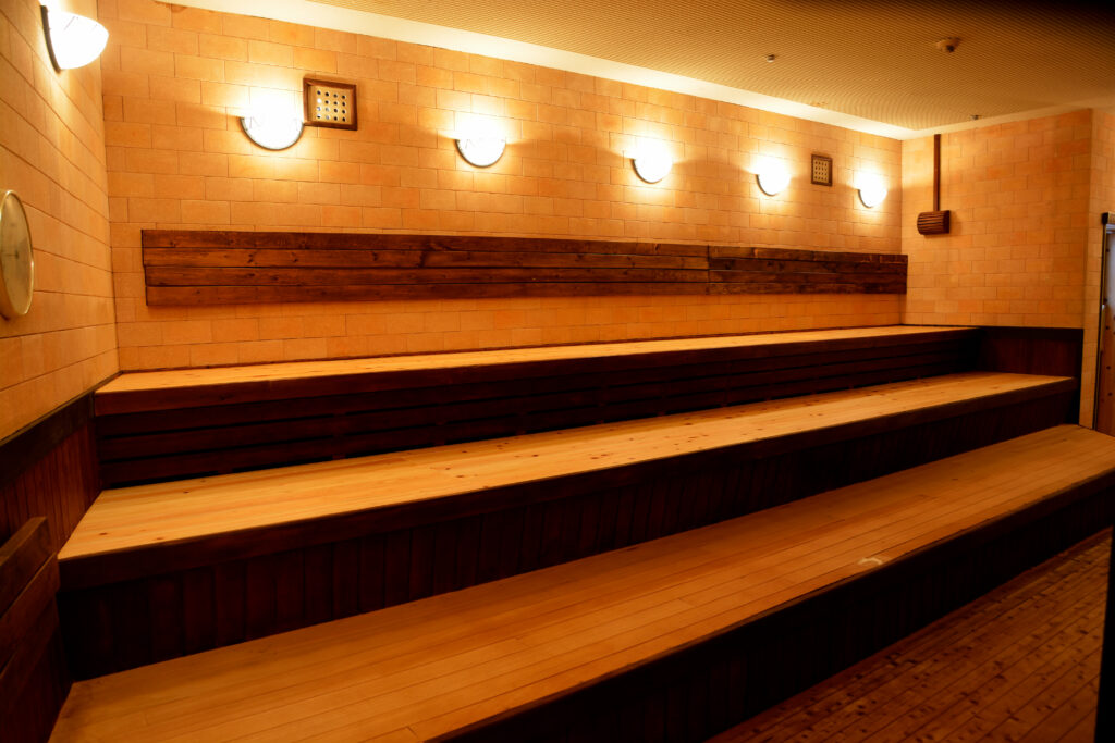 高温・多湿設計の広々としたサウナ室では、独自の「爆風ロウリュ」を含むさまざまなロウリュが楽しめます。